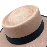 This edgy Panama Hat has a slight tilt on the crown giving it a modern and chic style The creme color Toquilla palm against the grey edge, was design to complement all skin tones while being a neutral to combine any oufit.